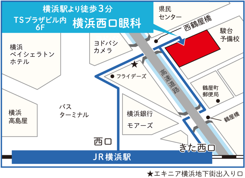 | アクセス | ・JR横浜駅西口から徒歩3分。 ヨドバシカメラの手前を右に入り、橋を渡ってすぐ右側にございます。県民センター向かい。 ・横浜駅きた西口から徒歩3分。 鶴屋橋渡りすぐ左折、信号手前右手にございます。 |